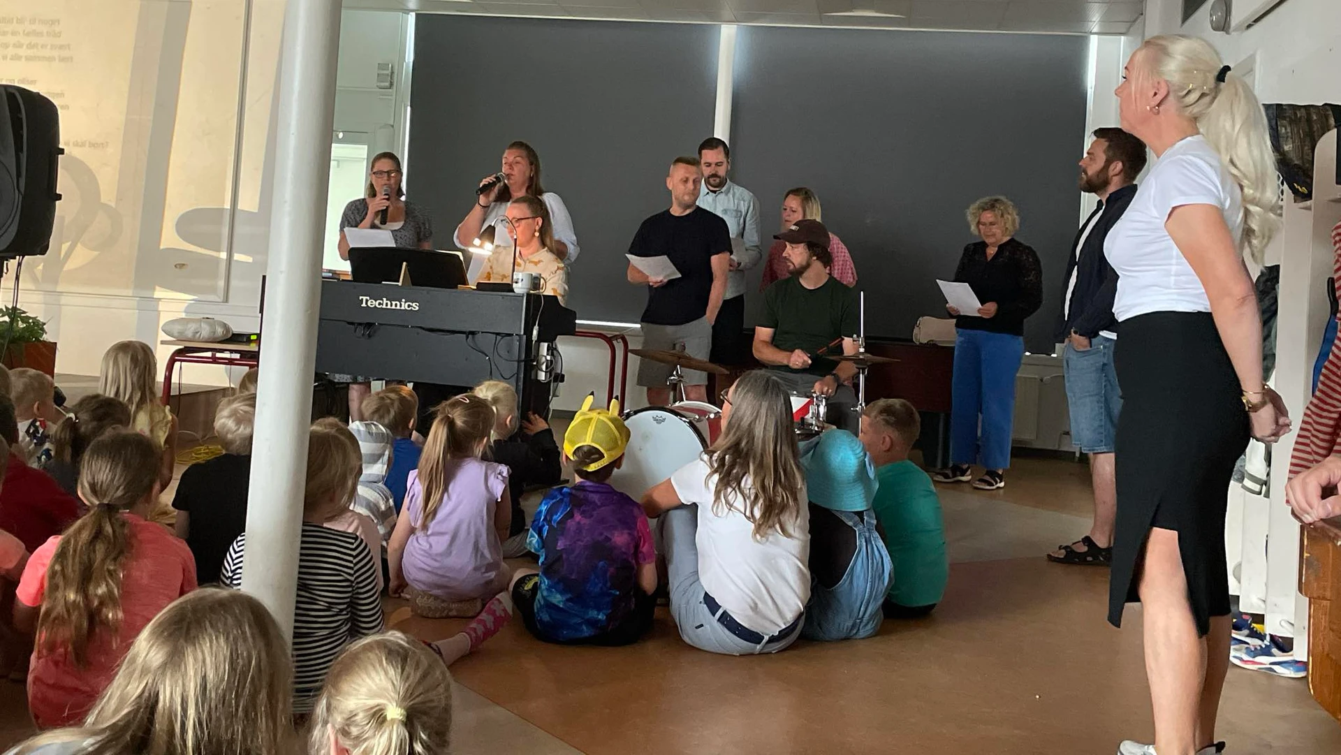To gange om ugen inviterer vi børn og forældre til ugentlige morgensamlinger i Underhuset (0.-5. klasse), hvor et lærerband spiller til.